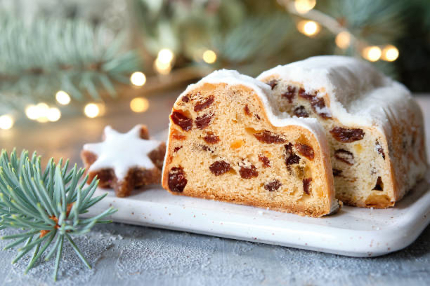 シュトーレンとは、ドイツのクリスマスに欠かせない発酵菓子で、バターやドライフルーツ、ナッツをたっぷり練り込んだパンに粉砂糖をまぶしたものです。