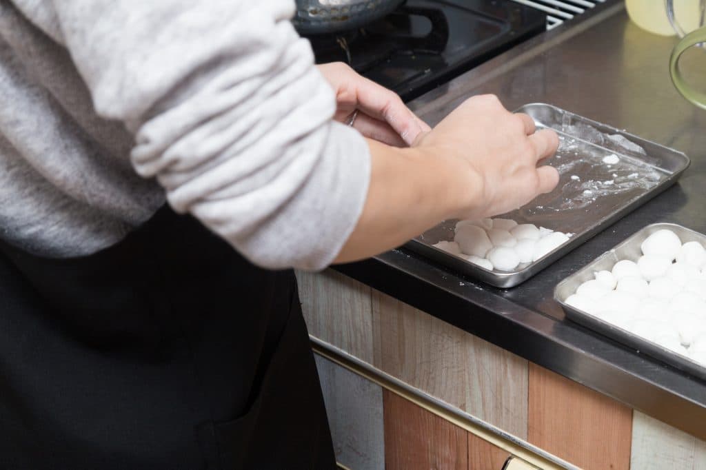 生地がまとまったら、小さな一口サイズの団子を手で丸めて作ります。均等な大きさにすると、ゆであがりが均一になります。