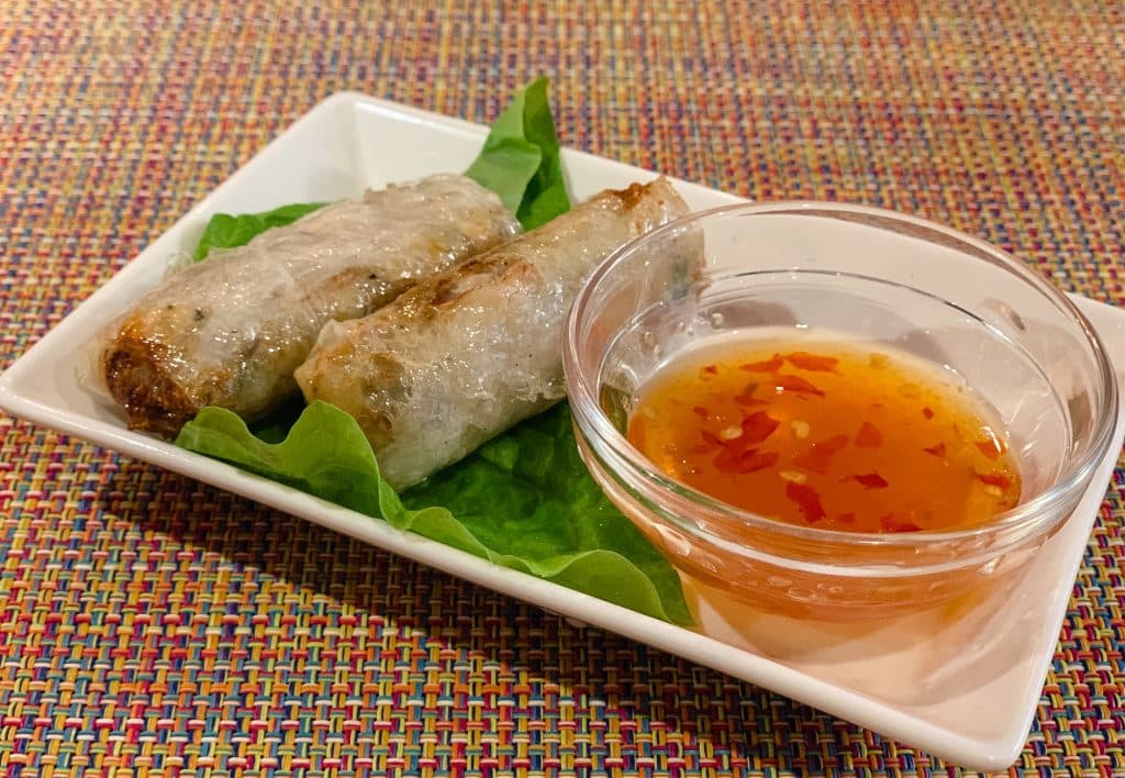 材料としては、豚肉・エビ・カニなどの海産物。さらに、キクラゲ・タロイモ・春雨・ニンジン・玉ねぎなどが用いられ、ライスペーパーで包んで揚げられています。