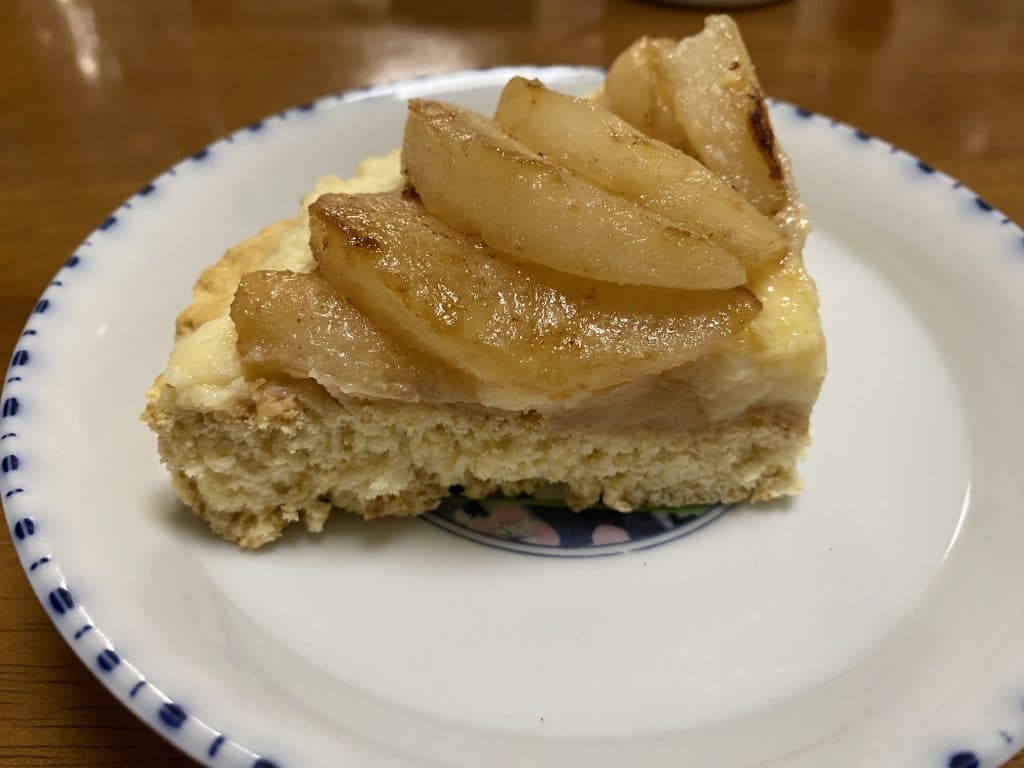 梨の「ひんやり」とした甘さとキャラメルの効いた甘さの相性はよくとてもおいしいタルトでした!