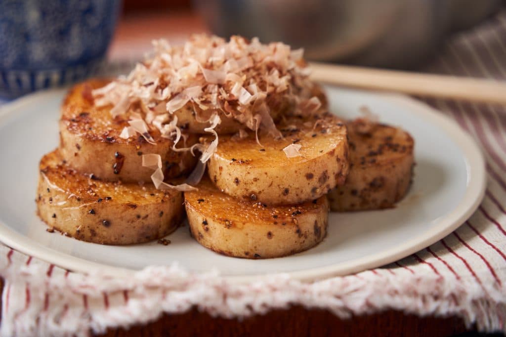 皮をむいた長芋を輪切りにし、バターやオリーブオイルで両面を焼き、しょうゆや、塩で味付けします。