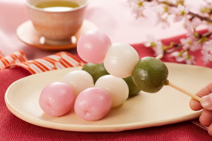 三色団子は、ピンク、白、緑の3色のお団子を串に刺した日本の伝統菓子です。