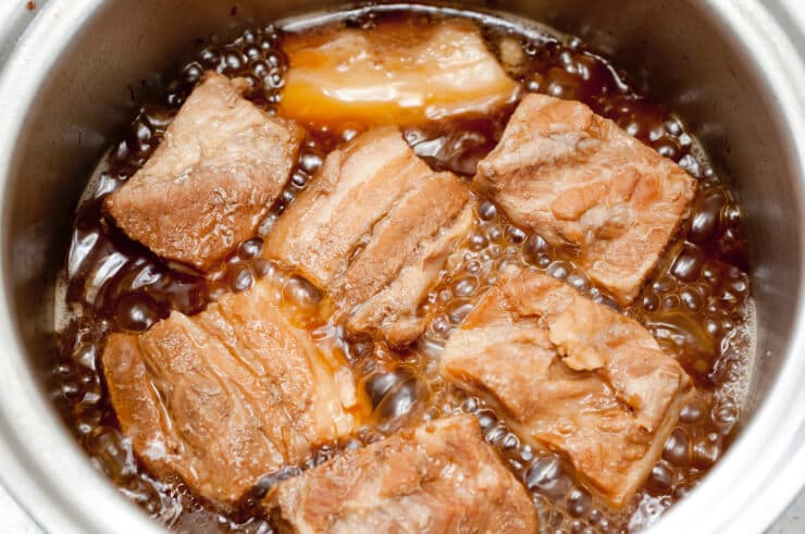 醤油を加えて、さらに30分〜1時間、お肉がとろとろになるまで煮ましょう。途中で煮汁が減りすぎたら、水を足して調整します。