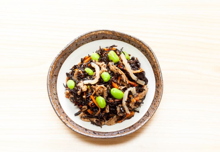 ひじきは、日本の伝統的な海藻の一種で、乾燥させた状態で市販され、戻してから煮物や炒め物、サラダなどに使われています。