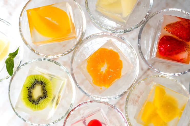 透明なゼリーの中に色とりどりの果物が浮かぶ、まるで宝石のような一品。オレンジ、グレープフルーツ、ブルーベリー……光を通してキラキラ輝く断面は、思わず写真を撮りたくなる美しさ。見た目も味もすっきりで、暑い日でもペロリ。
