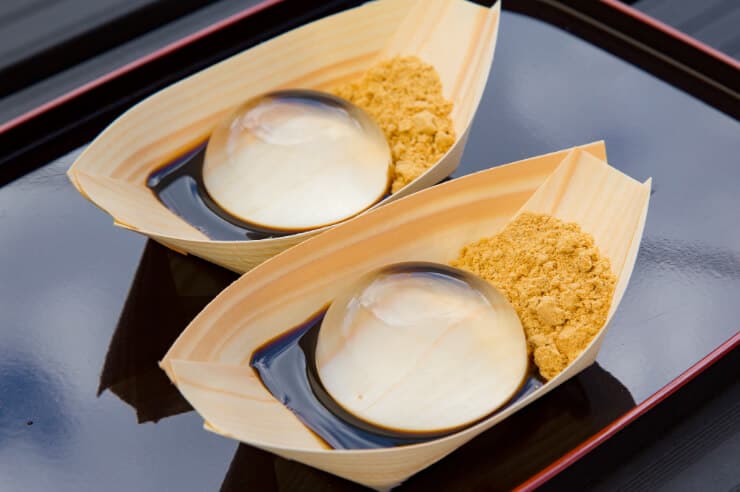 「水信玄餅」は、透明感あふれるぷるぷるとした寒天生菓子に、きな粉と黒蜜を添えていただく夏限定の和スイーツです。