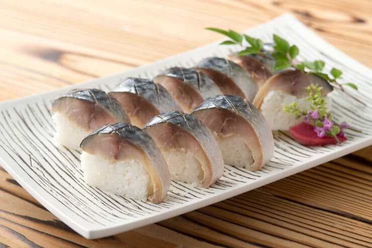 - 大阪を代表する押し寿司。酢締めした鯖を酢飯に乗せ、昆布を添えて押し固める。