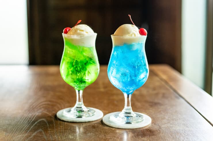 特に、バニラアイスを浮かべた「クリームソーダ」は、緑と白の対比が美しく、まるでスイーツのような見た目でも楽しめる一品です。