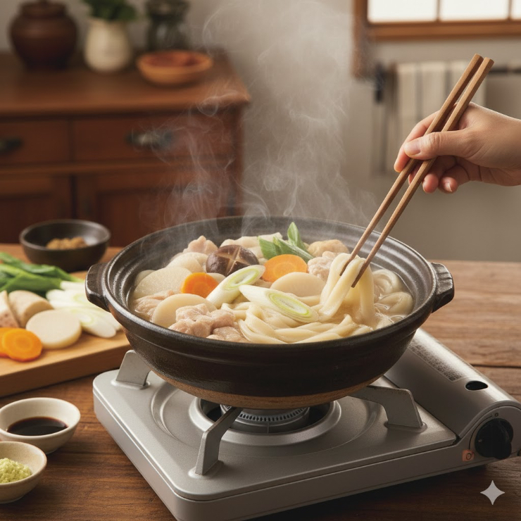 生麺をそのまま鍋に入れて煮込むため、小麦から自然にとろみが出て、スープにまろやかさが加わります。