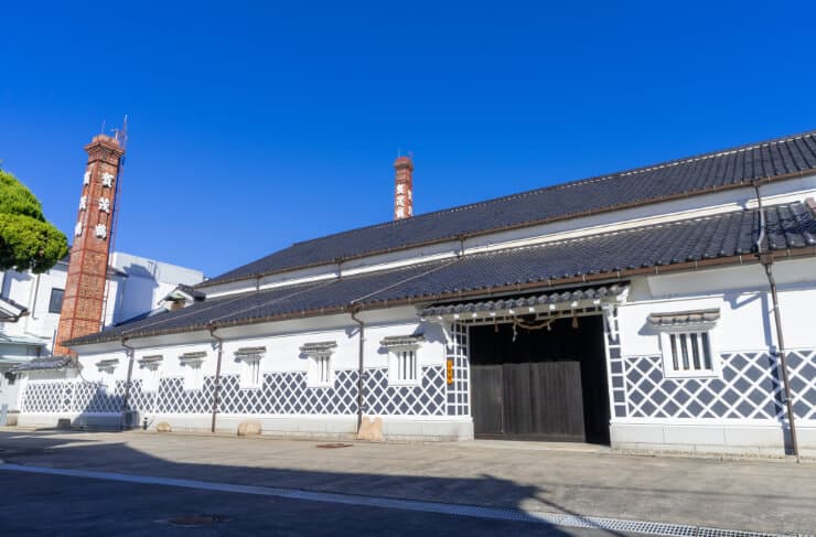 ・西条酒蔵通りの白壁と赤レンガ煙突が映える街並み