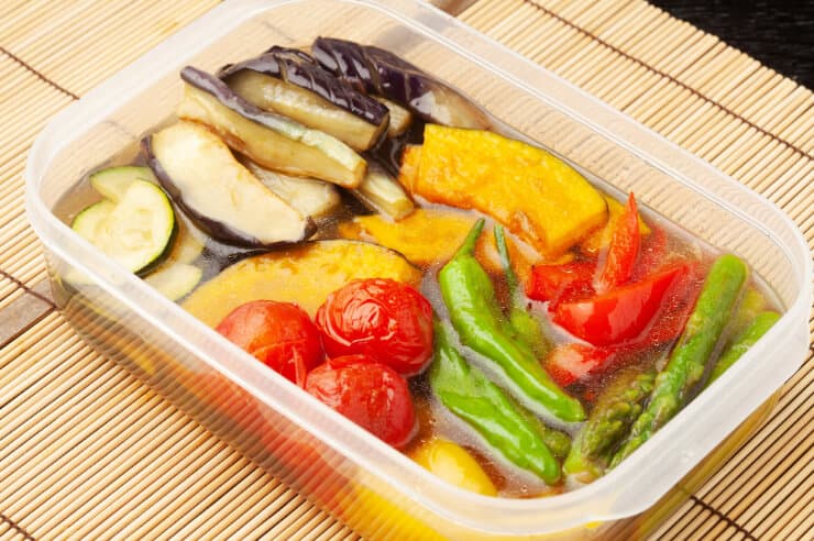 - 揚げた野菜をバットや容器に入れ、つゆをかけて30分以上漬け込む。