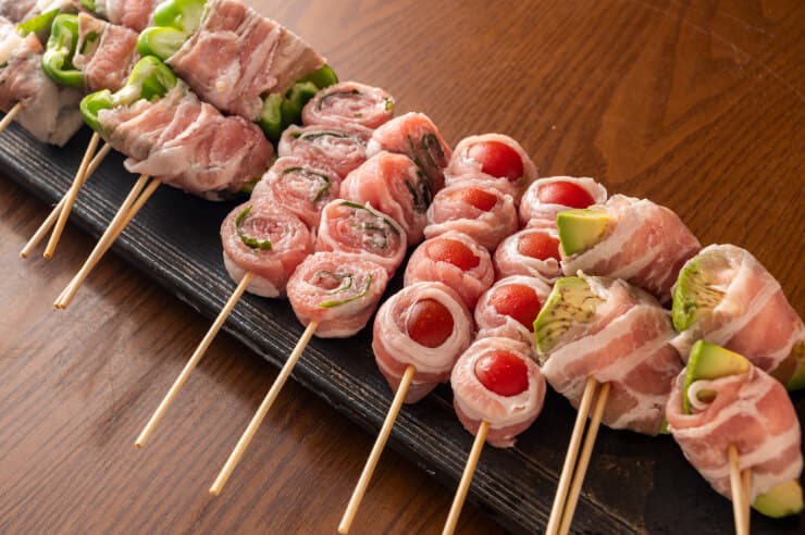 トマトやアスパラの肉巻き、チーズを使った創作串など、ヘルシー志向やSNS映えにも対応。