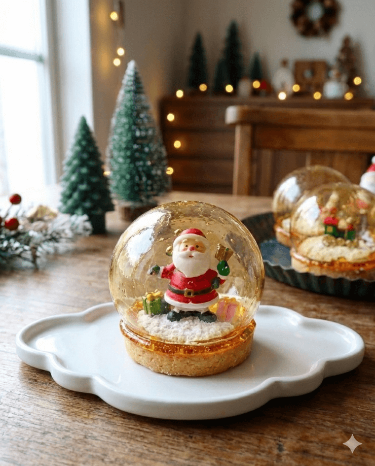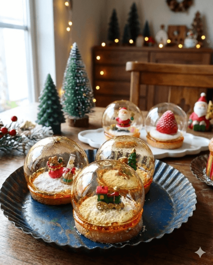 球体や半球状に仕上げた飴の内部に、雪をイメージした白いパーツやミニチュア風のデザインを配置し、スノードームのような世界観を表現しています。