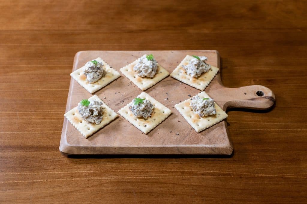 いぶりがっこのスモーキーで風味豊かな味わいと、クリームチーズのクリーミーでまろやかな口当たりが絶妙にマッチしています。いぶりがっこの独特な塩気と酸味が、チーズの豊かな風味と調和し、一口食べるたびに舌の上で踊ります。クラッカーと一緒にご賞味ください。
